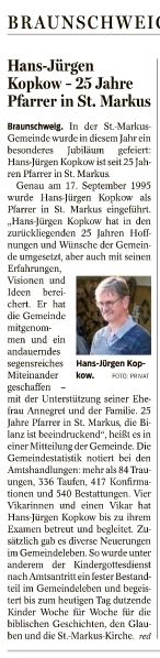 In der Ansprache klangen die Meilensteine des zurückliegenden Vierteljahrhunderts an, was eine beachtenswerte Menge Schaffenskraft erkennen ließ: Exemplarisch sei hier nur der Kirchenneubau, die Mentorschaft für vier Vikarinnen und einen Vikar, drei Veränderungen im Stellenzuschnitt, eine medienwirksame anonyme Großspende sowie ein neuerliches Bauprojekt am Gemeindezentrum St. Markus genannt. Zudem hob Kullik Kopkows Ehrgeiz hervor, den seit 2014 bestehenden Pfarrverband Braunschweiger Süden mit Leben zu erfüllen.