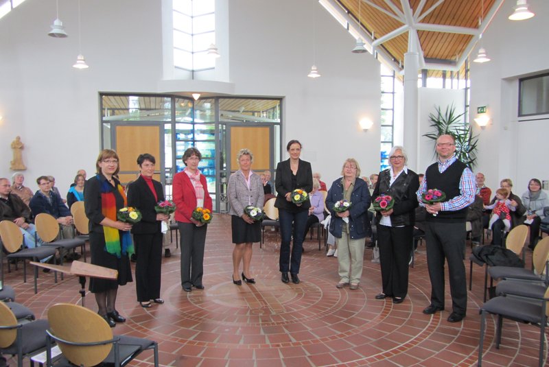 Neue Kirchenvorstände erhielten Blumen zur Einführung (v. l.): Regina Marwik, Margitta Kullik, Silvia Hansen, Sigrid Pfeiffer, Sabine Riechers-Vogt, Ruth Meeske, Heike Löffler und Nils-Patrick Wiedmann